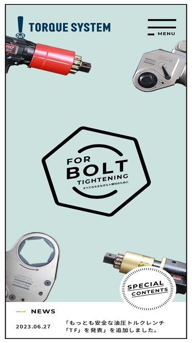 100%大型ボルト締め付け工具の専門メーカー『トルクシステム株式会社』。トルクシステムでは、油圧トルクレンチ、エアートルクレンチ、ボルトテンショナーをはじめとした、ボルト締め付け、軸力管理のエキスパートとして、工具やシステムの販売・レンタル・品質管理を行います。また、現場経験豊富な技術者の派遣、指導員の手配も行っております。