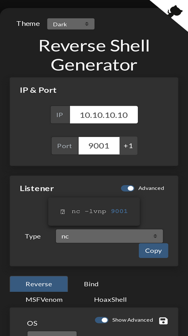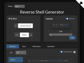 75%Online Reverse Shell generator with Local Storage functionality, URI & Base64 Encoding, MSFVenom Generator, and Raw Mode. Great for CTFs.