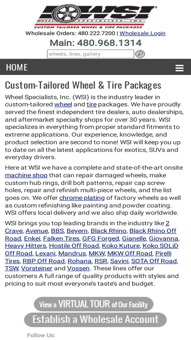 83%wheel specialists inc. (wsi) is the industry leader in custom-tailored wheel and tire packages. we have proudly served the finest independent tire dealers, auto dealerships, and aftermarket specialty shops for over 25 years. wsi specializes in everything from proper standard fitments to extreme applications. our experience, knowledge, and product selection are second to none! wsi will keep you up to date on all the latest applications for exotics, suvs and everyday drivers. free local delivery in arizona (phoenix: daily, tuscon: weekly). fast shipping to other parts of the country.