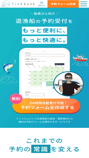 83%【fishbank・フィッシュバンク】は完全無料の釣り船・遊漁船専用ネット予約フォーム。24時間予約可能で集客UP!月間カレンダーで予約管理も簡単。リンクを貼るだけで導入OK!