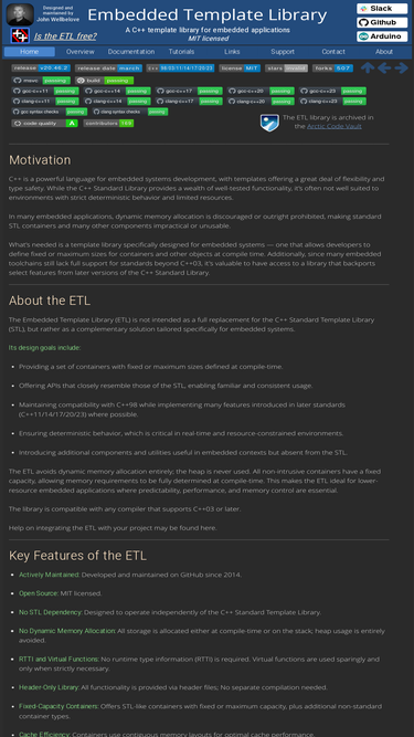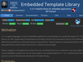 60%c++ etl embedded template library boost standard template library standard library stla c++ template library for embedded applications the embedded template library has been designed for lower resource embedded applications. it defines a set of containers, algorithms and utilities, some of which emulate parts of the stl. there is no dynamic memory allocation.