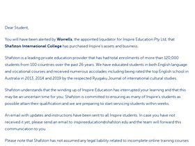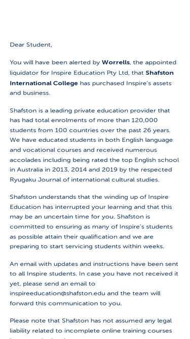 72%dear student, you will have been alerted by worrells, the appointed liquidator for inspire education pty ltd, that shafston international college has purchased inspire’s assets and business. shafston is a leading private education provider that has had total enrolments of more than 120,000 students from 100 countries over the past 26 years. we have educated […]