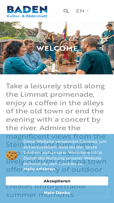 95%Herzlich Willkommen in der Kultur- und Bäderstadt! Lass dich mitreissen und entdecke die kulturellen Highlights in Baden. Hier bist du an der Quelle von kulinarischer Vielfalt und gelebter Gastfreundschaft. Bei uns erreichst du deine ganz persönliche Wohlfühltemperatur aus Abenteuer, Erholung und Inspiration. Tauche ein in die Kultur- und Bäderstadt Baden.