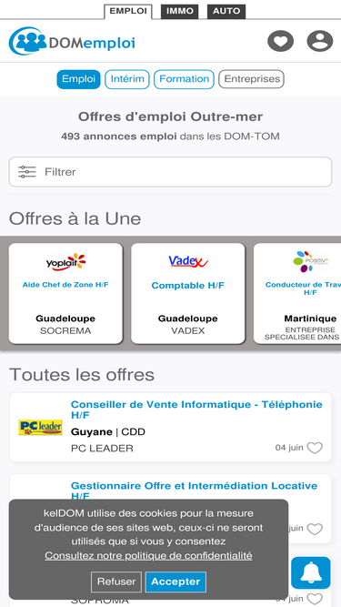 72%n°1 des annonces emploi outre-mer. offres d'emploi, missions d'intérim et annonces de formation. dépôt de cv. votre job dans les dom-tom.