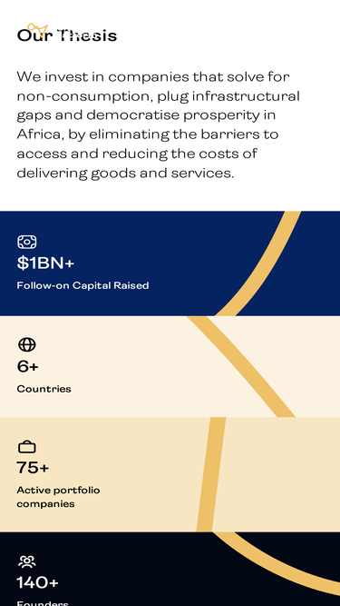 We back founders building the future of Africa. We invest in companies that solve for non-consumption, plug infrastructural gaps and democratise prosperity in Africa, by eliminating the barriers for access and reducing the costs of delivering goods and services.