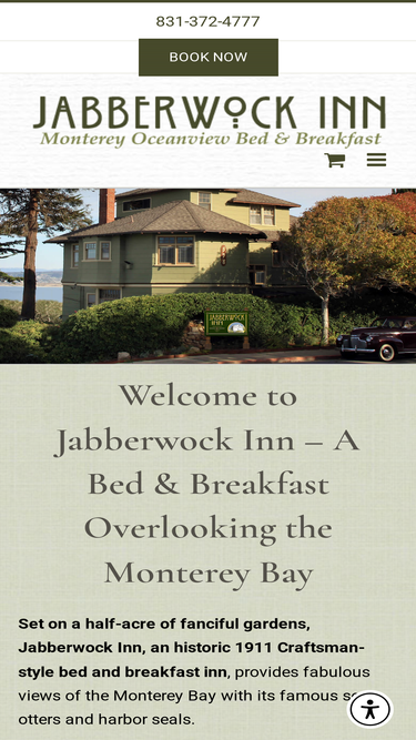 84%Jabberwock Inn, Rated #1 on Trip Advisor, is an Ocean View Monterey Bed & Breakfast. Be enchanted by this romantic Monterey B&B that offers a free breakfast, wine and hors d'oeuvres, a Bocce Court and vast English Gardens.