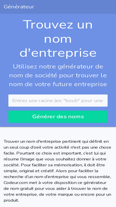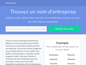 82%Générez gratuitement des centaines d'idées de noms pour votre entreprise, votre marque, votre site web ou vos produits. Grâce à notre algorithme, vous trouverez le nom idéal pour votre société ou votre site internet à coup sûr. Entrez simplement la racine de votre nom d'entreprise et découvrez + de 200 propositions.