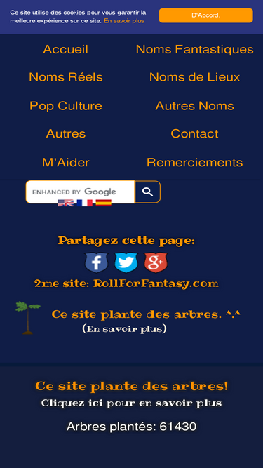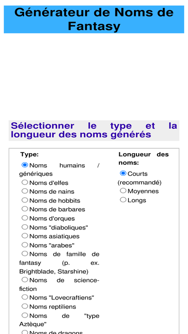 88%générateur de nom pour les rpg, les jeux vidéo, romans, etc. peut générer des noms pour elfes, nains, barbares, noms "diaboliques", noms "lovecraftiens" et plus