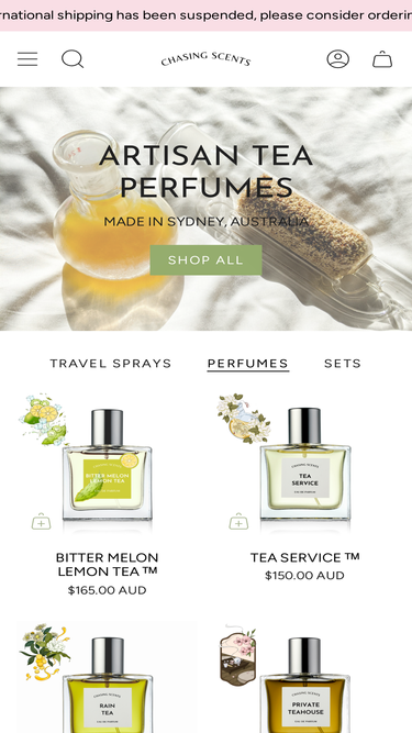 74%Chasing Scents is an independent perfume house in Sydney, Australia dedicated to high quality scents in small batches. Featuring in-house whole flower buds and tea extracts. The process requiring delicate control of extraction conditions and cycles in a Soxhlet apparatus to collect an aromatic concentrate.