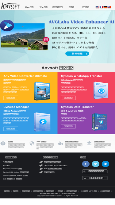 82%anvsoft は windows と mac ユーザー向け、dvdコピーと変換、動画変換、iphone同期、スマホ管理、音声変換、動画写真高画質化などのソフトを提供しております。dvd、avi、mpeg、mp4、wmv、iphone、ipad、ipod、psp、android、ウォークマン動画などの形式を対応します。