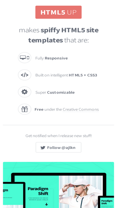 A simple (gradient-heavy) single pager that revisits a style I messed with on two previous designs (Tessellate and Telephasic). Fully responsive, built on Sass, and, as usual, loaded with an assortment of pre-styled elements. Have fun! :)