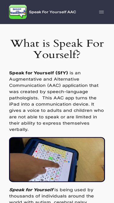 92%speak for yourself (sfy) is an augmentative and alternative communication (aac) application that was created by speech-language pathologists. this aac app turns the ipad into a communication device.