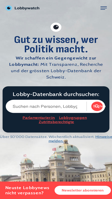 83%Das Gegengewicht zur Lobbymacht. Wir recherchieren & decken Lobbying in der Schweiz mit unserer Datenbank auf. Für mehr Transparenz und Demokratie.