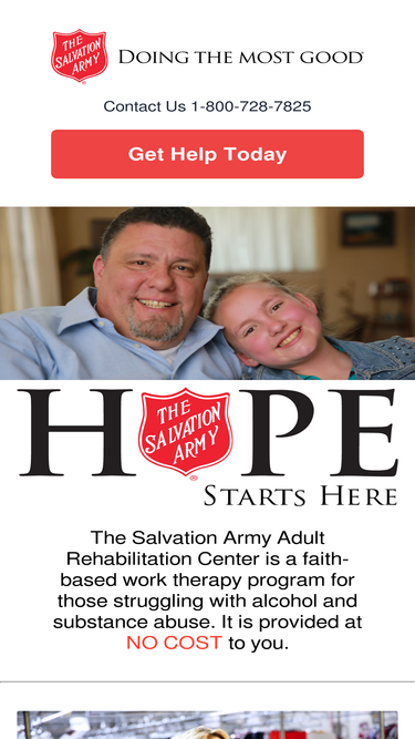 95%The Salvation Army Adult Rehabilitation Center is a faith-based work therapy program for those struggling with alcohol and substance abuse. It is provided at NO COST to you. Watch a personal testimony of a life changed. View more info on our rehabilitation centers. Contact us by phone at 1-800-728-7825