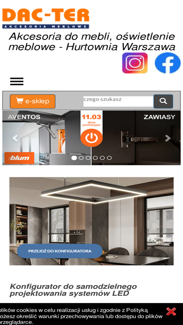 65%witamy w dac-ter akcesoria meblowe, oferujemy sprzedaż hurtową i detaliczną, posiadamy oddziały w warszawie i prowadzimy sprzedaż internetową na terenie całego kraju. nasz dewiza to elegancja i funkcjonalność dlatego mamy nadzieję, iż wśród zaprezentowanych artykułów znajdą państwo również coś dla siebie. szczególny nacisk kładziemy na uchwyty meblowe, klamki meblowe i gałki meblowe oraz oświetlenie led (m.in. taśmy i profile). zapraszamy do zapoznania się z przedstawioną ofertą.