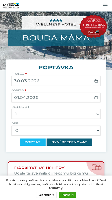 75%Wellness hotel Bouda Máma, Pec pod Sněžkou 124, 542 21 Trutnov. Objednávky: +420 244 46 56 66, Mobil: +420 602 304 989.