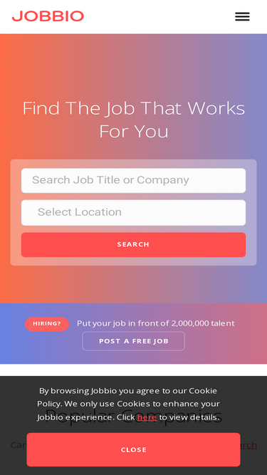 83%Jobbio is a job search platform that connects great talent like you with great companies quickly, directly and privately. 6,000+ companies post job opportunities on Jobbio, and you can learn about their mission, their teams and their culture. Start a job search and find the job that works for you!