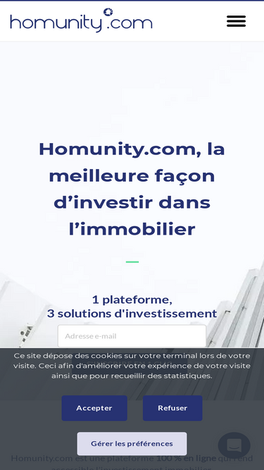 95%Besoin de conseils sur l'investissement immobilier ou d'aide technique ? Contactez Homunity via notre formulaire en ligne ou par téléphone. Nos experts sont là pour répondre à vos questions et vous accompagner.