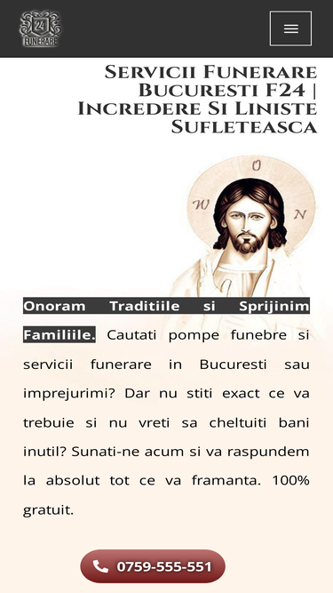 Pompe funebre F24: servicii funerare complete Bucuresti, sprijin emotional permanent, recunoastere internationala si recenzii de numai 5 stele. Servicii si pachete funerare complete. 100% gratuite pt. pensionari si asigurati. Lasati in seama noastra totul, de la deces pana la inmormantare si parastasul de dupa.