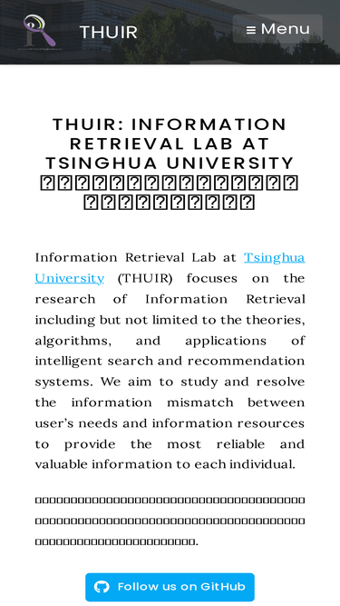 100%Information Retrieval Lab at Tsinghua University (THUIR) focuses on the research of Information Retrieval including but not limited to the theories, algorithms, and applications of intelligent search and recommendation systems. We aim to study and resolve the information mismatch between user's needs and information resources to provide the most reliable and valuable information to each individual.