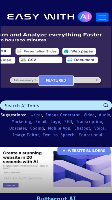 85%easy with ai is home to one of the largest collections of ai tools and resources on the internet. find & search ai tools in over 50+ different categories.