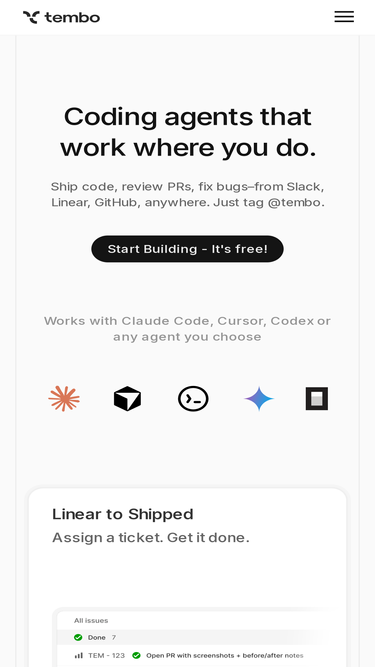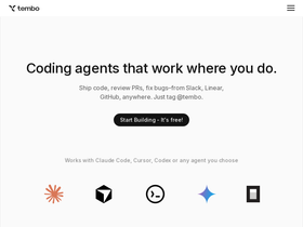 85%Ship code, review PRs, and fix bugs with autonomous coding agents. Works with Claude Code, Cursor, Codex—from Slack, Linear, GitHub, or anywhere. Just tag @tembo.