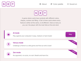 76%Set is a visual game where cards have symbols with different colors, shapes, number and filling. Grab as many Sets as you can: the player with the most at the end wins!