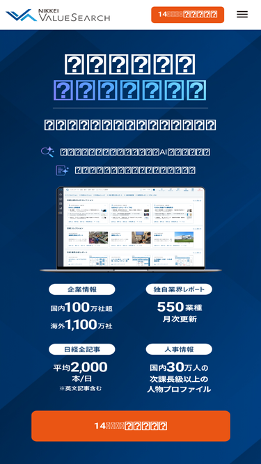 74%企業情報・業界動向の調査・分析ツールなら「日経バリューサーチ」。日経ならではの圧倒的な情報力で、市場や他社の情報・動向の比較・分析を手助けします。充実のレポート作成機能があなたのビジネスを強力にサポート。14日間の無料トライアル実施中!