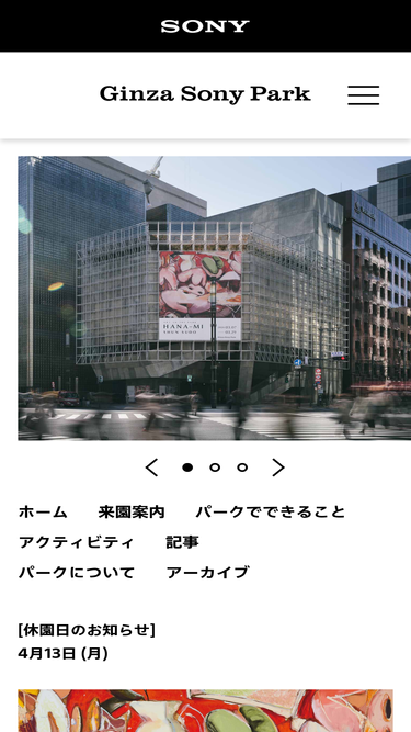 100%Displaying a Ginza Sony Park access guide, hours, floor map, facilities information, and frequently asked questions.