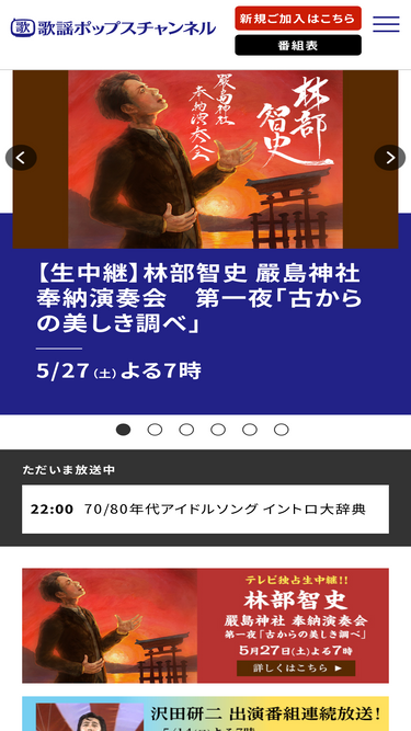 79%演歌・歌謡界で活躍する若手イケメン歌手の魅力をお届けするCS放送「歌謡ポップスチャンネル」の人気番組!スカパー!、または、J:COMデジタル、お近くのケーブルテレビ局(一部の局を除く)、ひかりTVなどで放送中!