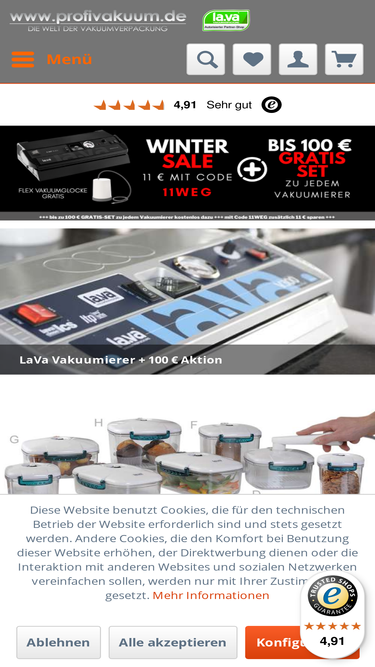 79%Bis zu 70 € Gratis Zugabe beim Kauf sichern: Wählen Sie: Bis zu 70 € Gratis Zubehör oder 5 Jahre Garantie* + Zubehör Wählen Sie das gewünschte Gratis-Set im Menu oberhalb des "Warenkorb-Button" aus und klicken Sie dann "in den Warenkorb". Beschreibung: Vakuumgerät V.100 ® Premium X Halbautomatisches Lava Vakuumgerät mit Doppelschweißnaht - perfektes Einsteigergerät für hohe Ansprüche Das Vakuumgerät V.100® Premium X bringt alles mit, um dir den Einstieg in die professionelle Vakuumverpackung so einfach wie möglich zu machen. Das übersichtliche Bedienelement erlaubt eine besonders einfache und intuitive Handhabung. Dank der starken Pumpe erreicht das Vakuumgerät einen maximalen Unterdruck von bis zu -0,94 bar. Anhand einer optischen Balkenanzeige kannst du den Unterdruck stets im Auge behalten. Den Schweißvorgang leitest du manuell per Tastendruck auf "Schweißen" ein. Dank einer Schweißbandlänge von 340 mm verschweißt du mit dem V.100® Premium X alle gängigen Vakuumbeutel- und Vakuumrollengrößen. Die Doppelschweißnaht sorgt dabei für doppelten Schutz. Mit dem passenden Zubehör vakuumierst du außerdem auch Behälter, Schüsseln, Dosen, Töpfe, Flaschen und Gläser. Geeignet für: Angler Jäger Küchenprofis FUNKTIONEN Schweißen per Knopfdruck: Leite den Schweißvorgang durch kurzes Drücken des Schweißknopfes ein. Vakuumiere und verschweiße professionell Lebensmittel, Industrieteile und sonstige Gegenstände. Bleib flexibel: Vakuumiere nicht nur Beutel, sondern auch Lava Vakuumbehälter (perfekt für Flüssigkeiten) oder nutze die Lava Universaldeckel um sogar Töpfe, Schüsseln oder Dosen zu vakuumieren. Die benötigte Absaugvorrichtung ist bereits inklusive. Mit Hilfe der Lava Vakuumglocke vakuumierst du außerdem Einmachgläser und Twist-Off-Gläser im Handumdrehen. Schweißzeit stufenlos einstellbar: Perfekt, um verschieden starke Folien zu verschweißen, egal ob dünne Chipstüte oder ein stabiler 200 Mikron Beutel in Industriestärke. Optische Balkenanzeige des Unterdrucks: Ein