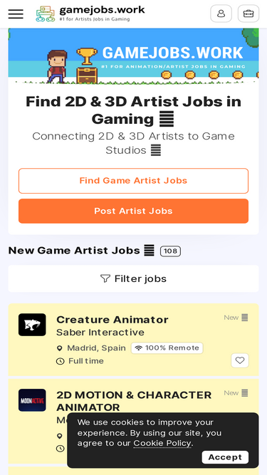 76%Find 2d artist jobs, 3d artist jobs, concept artist jobs, lighting artists, character artists, environment artists, game artists, animator jobs, game jobs, video game jobs, on gamejobs.work