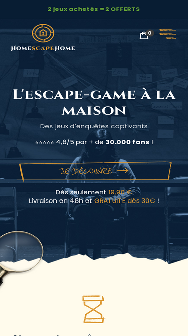94%Home Scape Home ce sont des jeux d'enquêtes à jouer à la maison ! Des jeux qui vous transportent au cœur d'une série d'enquête ! Notée 4,8/5