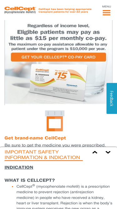 98%Learn how the CellCept® (mycophenolate mofetil) Co-pay Card Program can help eligible patients pay per monthly co-pay. See full safety for more information.