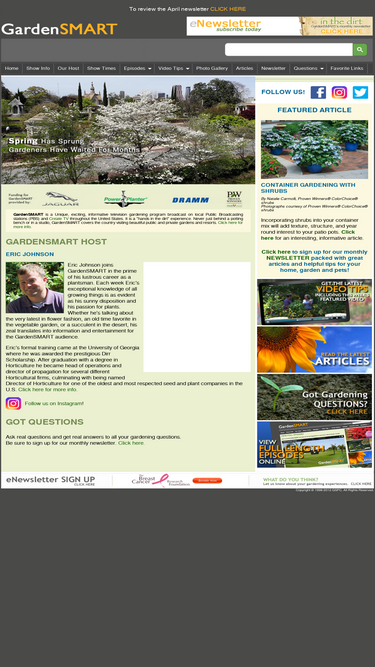 100%website for the pbs/etv gardening show, gardensmart: public and private gardens are visited and televised nationwide. show transcripts and plant lists are featured. gardening tips are offered for the home gardener, in print and video. garden/gardening articles are added weekly and questions are answered, all related to gardening in the differing climates and usda zones of the usa.