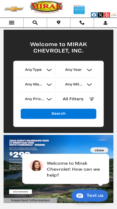 88%come to mirak chevrolet to browse our new and used chevy models for sale. schedule chevrolet service and apply for auto financing at our arlington chevy dealer.