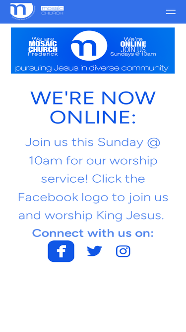 86%we're now online: - join us this sunday @ 10am for our worship service! click the facebook logo to join us and worship king jesus. connect with us