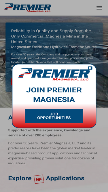 62%Premier Magnesia, LLC is a global market leader in magnesia-based products and solutions for dozens of applications ranging from agricultural to industrial and environmental markets. We are one of the worlds principal manufacturers and suppliers of high purity calcined magnesium oxide and magnesium hydroxide products. For over 50 years, the Company and its predecessors have owned and operated a magnesia mine and processing plant located in Gabbs, Nevada that will continue to offer the only domestically-mined source of magnesia ore in the United States well into the future. Our Giles Chemical Division is the largest producer of magnesium sulfate, commonly known as Epsom Salt, in North America. Premier Magnesia and Giles Chemical are your essential magnesia mineral source, assuring consistent quality, technical expertise, and long term reliable supply.