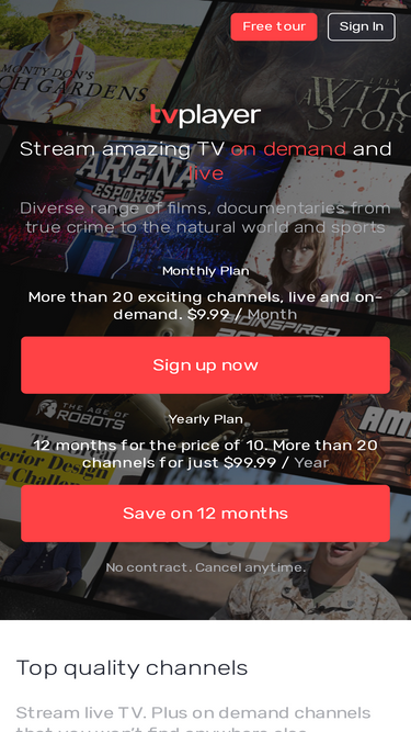 93%TVPlayer is home to the most popular TV channels and premium quality on-demand programmes, exclusive to TVPlayer. Watch over 40 live channels and thousands of hours of bingeable science, nature, travel, history and sports documentaries, contract-free and anywhere you like.