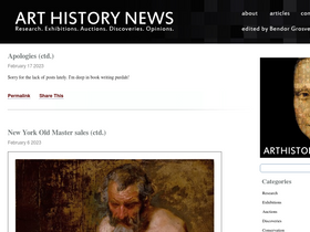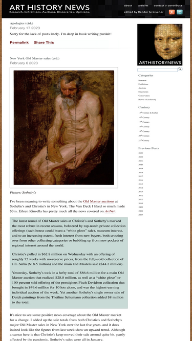 76%a history of art blog covering news stories on art history matters. the blog covers news of auctions from the likes of sotheby's, christie's and bonhams of old masters such as van dyck, rubens, titian, raphael, michelangelo and leonardo, british artists such as thomas gainsborough, thomas lawrence, joshua reynolds, george romney and william hogarth, as well as modern and contemporary artists from monet to damien hirst.