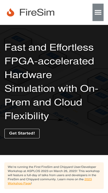 89%Our slides and video from our tutorial at the 2018 Chisel Community Conference are now available!The tutorial was broken into 5 sections, links to the video/slides are below: Introduction: Slides PDF | Jump to section in video Building and Deploying Simulations: Slides PDF | Jump to section in video Simulating Custom Designs: Slides PDF | Jump to section in video Debugging in FireSim: Slides PDF | Jump to section in video Project Management/Contributing/Conclusion: Slides PDF | Video unavailableFull session video: