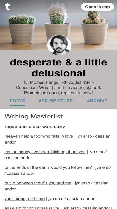 80%45. Mother. Fangirl. RP Addict. (Self-Conscious) Writer | anothersadsong @ ao3. Prompts are open, replies are slow!