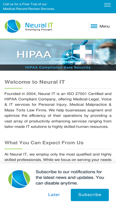 97%Neural IT provides ISO-certified, HIPAA and GDPR-compliant Medical-Legal, Voice & IT services tailored to Personal Injury, Medical Malpractice, and Mass Torts law firms. Enhance your efficiency and save costs with our trusted solutions.