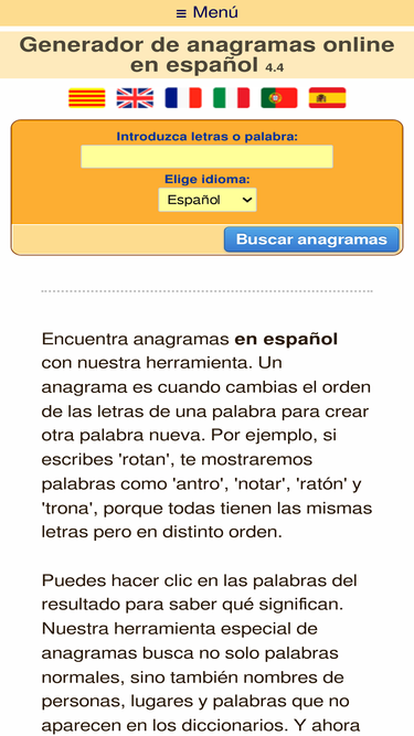 68%esta página sirve para encontrar anagramas. por ejemplo un anagrama de 'mosca' es 'comas' porque ambas palabras utilizan las mismas letras