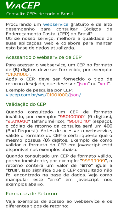 100%webservice gratuito para consulta de endereço via cep, suporta ajax e retorno nos formatos json ou xml.