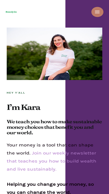 92%Hey y'all I'm Kara We teach you how to make sustainable money choices that benefit you and our world. Your money is a tool that can shape the world. Join our weekly newsletter that teaches you how to build wealth and live sustainably. Subscribe here Helping you change your money, so you can change the