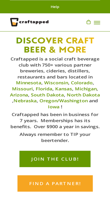 100%Craftapped brings together good people and great local establishments, who make and sell craft beers that you love. Enjoy 10 (BOGO) beers every month*, with any of our 850+ partners in 16 states, and become well versed in the local craft beverage scene – get out and try them all. Need Gift Cards? Click Here *Refreshed on day you originally signed up, each month. Membership does auto renew. *Need to redeem a Gift Card? Do that here * If you have a Digital Gift Card/Store Credit you want to redeem that via this link CLICK HERE.   More details on the program? FAQ Here