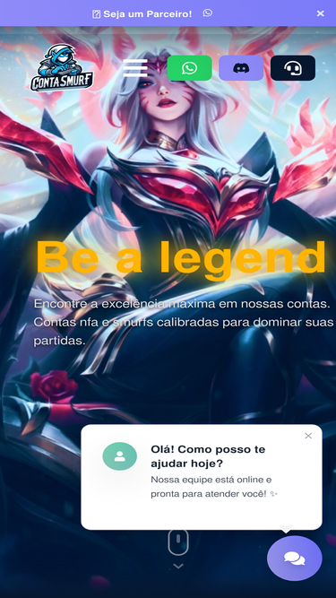 85%O portal definitivo para sua conta smurf/unranked. Com entrega imediata e atendimento dedicado ao cliente com: Smurf Aleatória, Smurf com Escolha de Skin, Smurf com Prime, Conta PBE, Valorant, Contas com elo e serviços especializados.