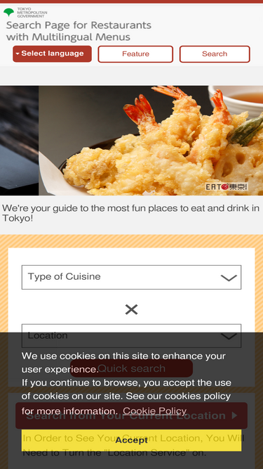 98%this site introduces restaurants in tokyo that have multilingual menus available. you can find out all about the culinary culture and huge range of restaurants in japan's capital, home to extremely popular japanese dishes and the finest gourmet from all over the world.