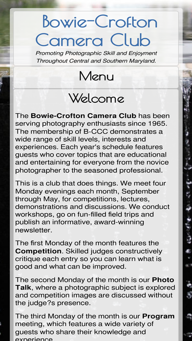 90%the bowie-crofton camera club has been serving photography enthusiast for over thirty years. in addition to bowie and crofton, our members come from a large geographical area that covers much of central and southern maryland, including annapolis, severn, waldorf, laurel and columbia.